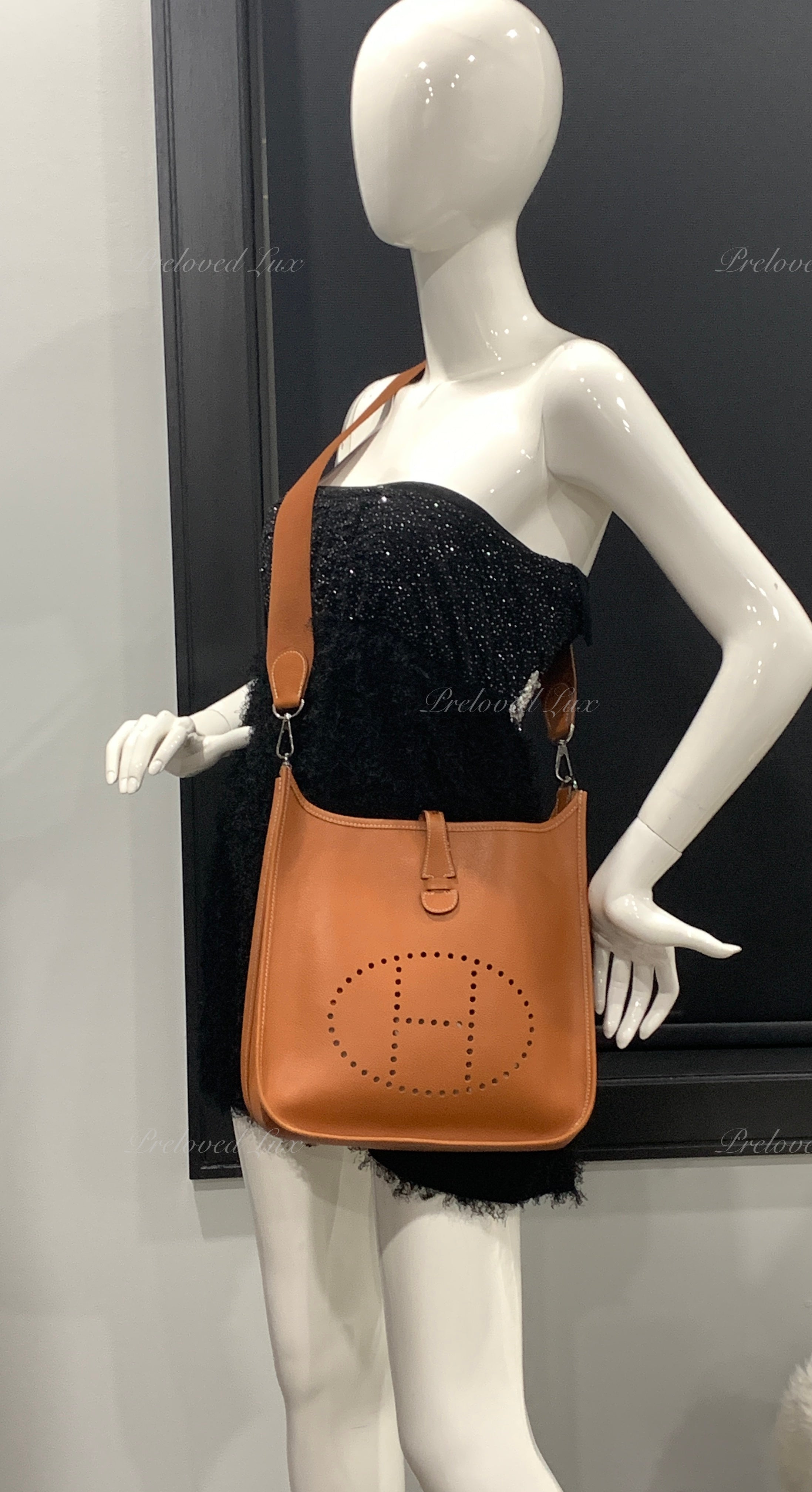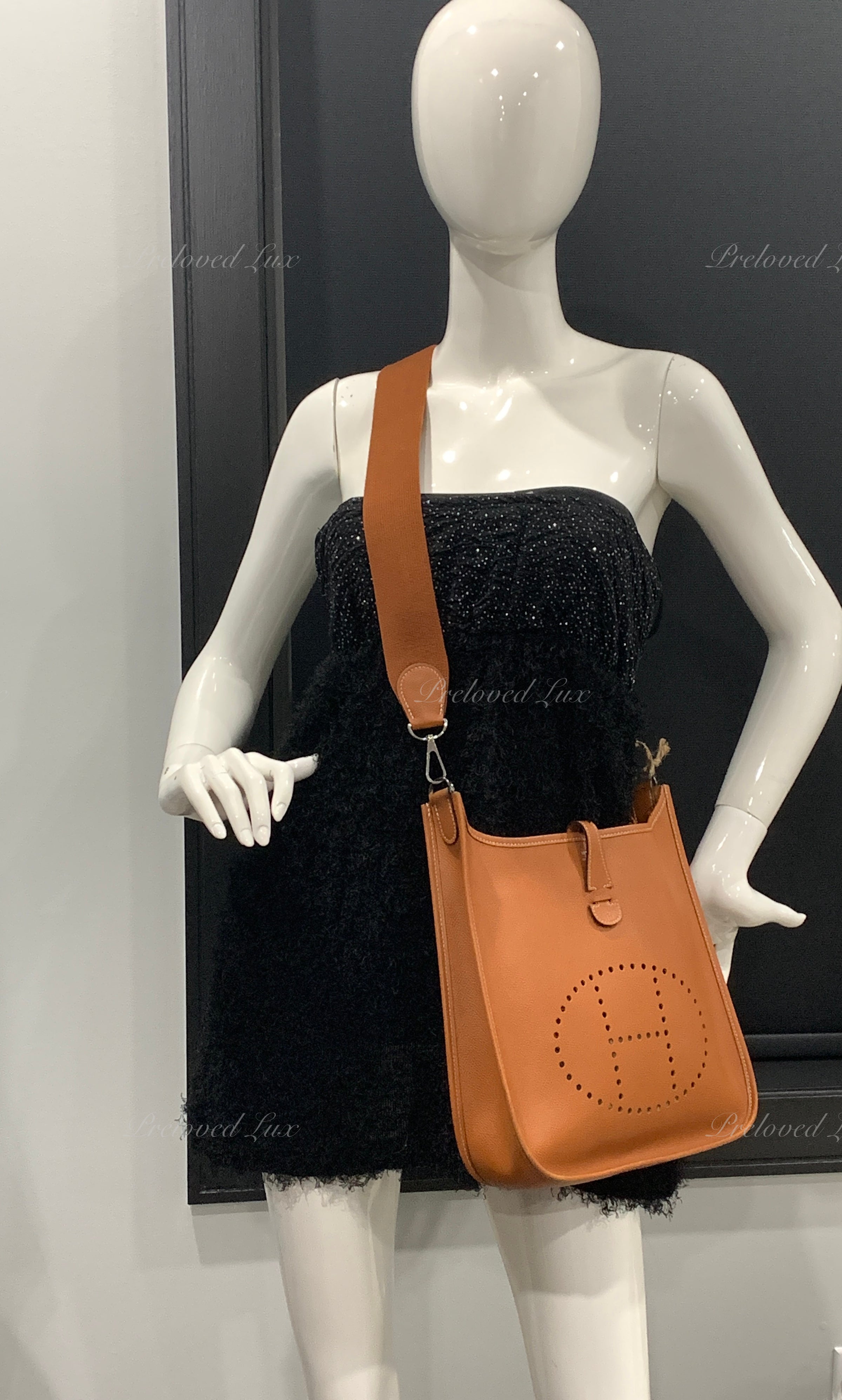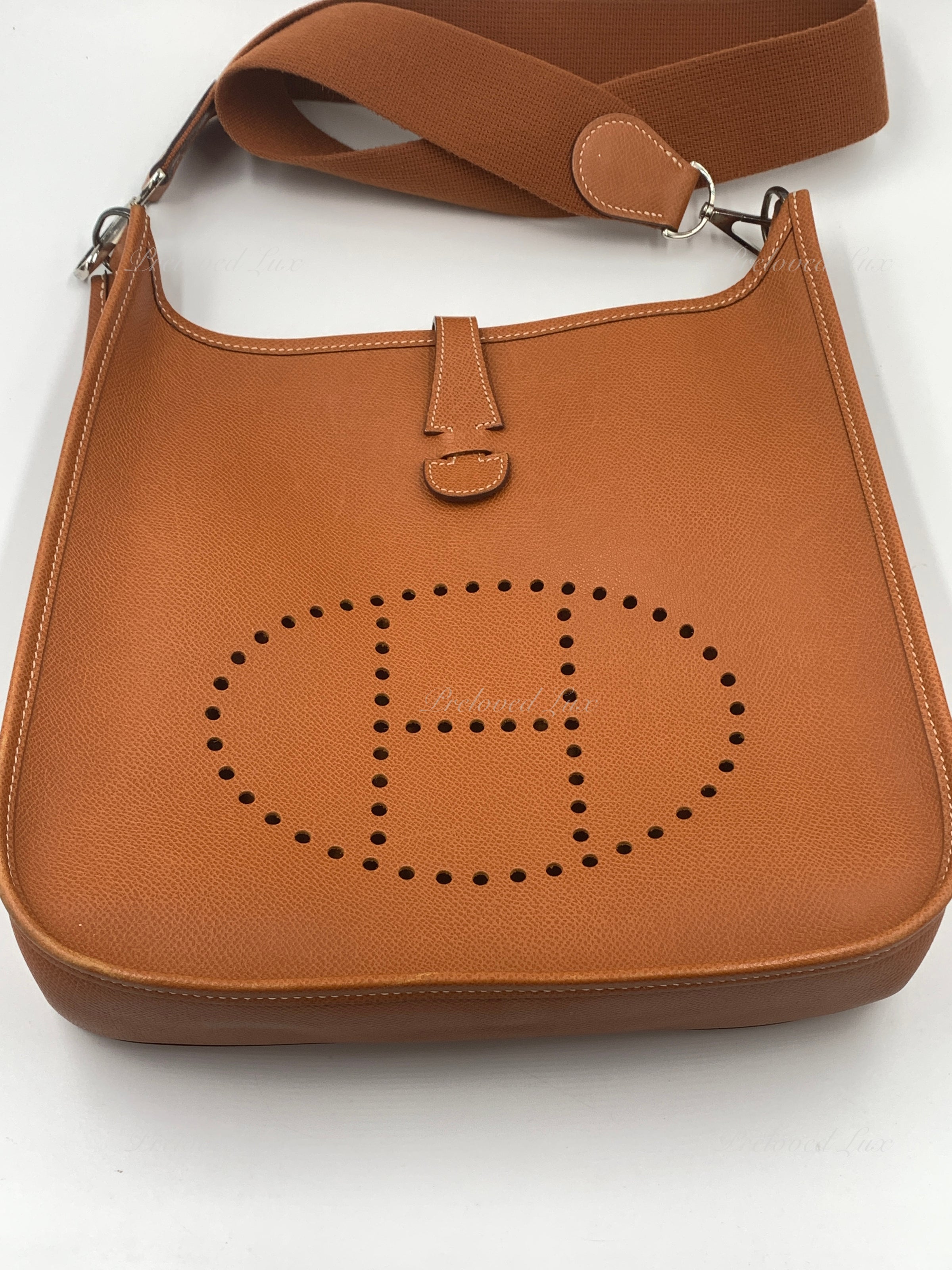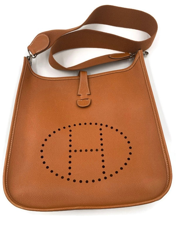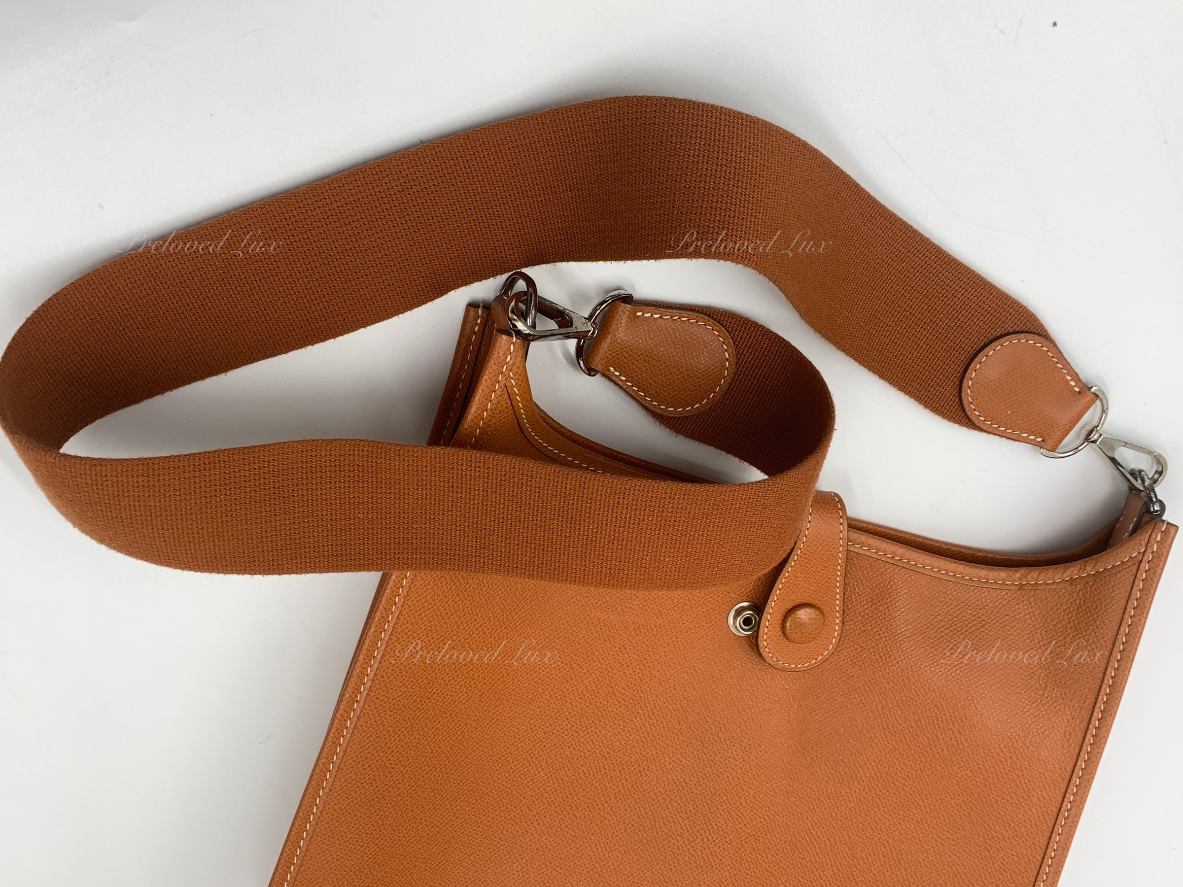 We guarantee this is an authentic Hermes PM Handbag or 100% of your money Back. This Hermes Evelyne Crossbody has perforated H design at the front, textile removable shoulder strap, and silver hardware. It opens to a raw leather interior.