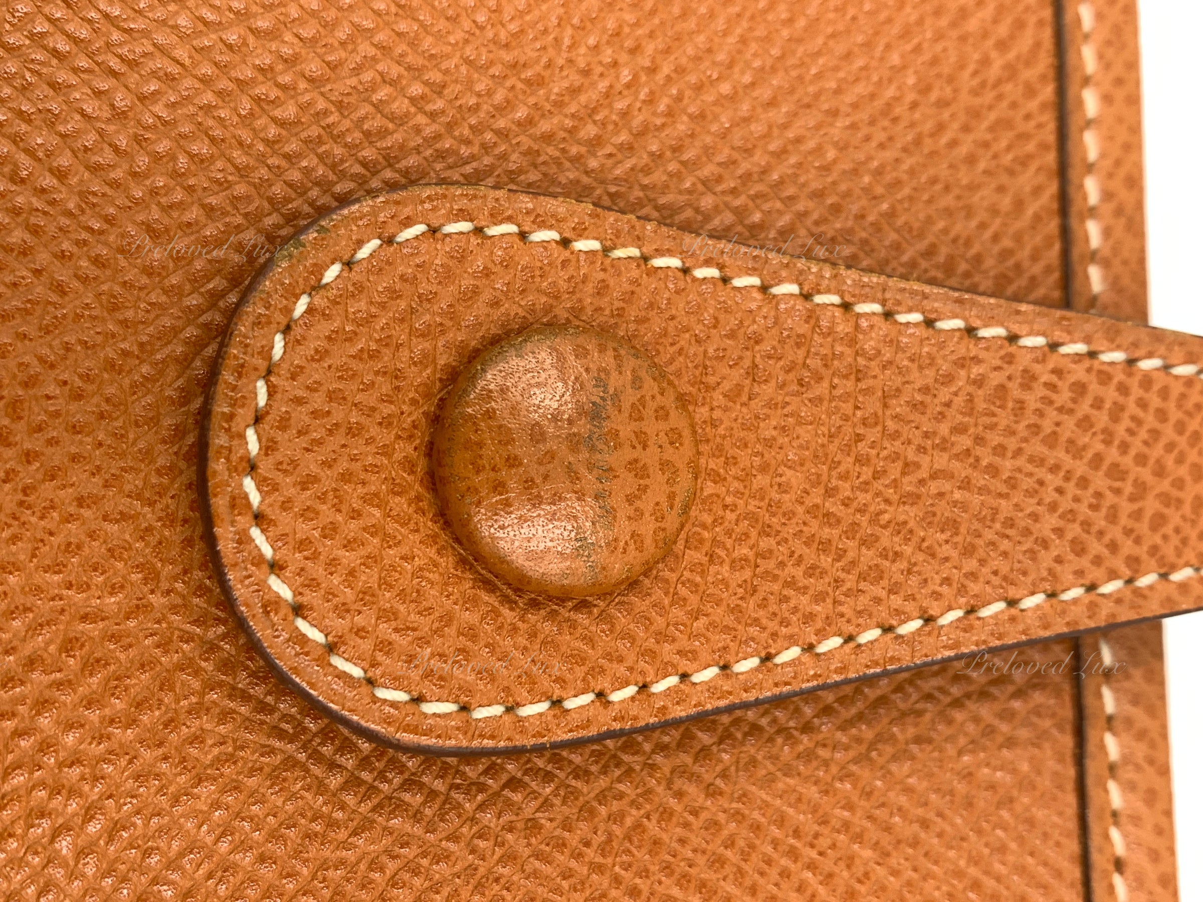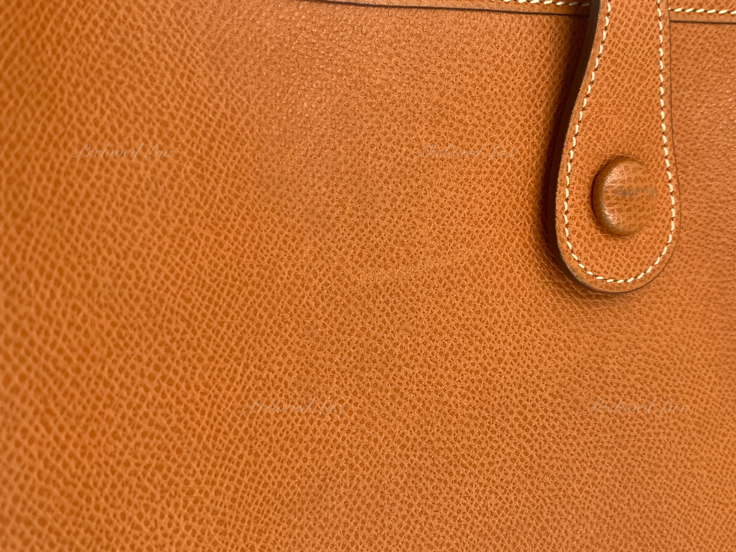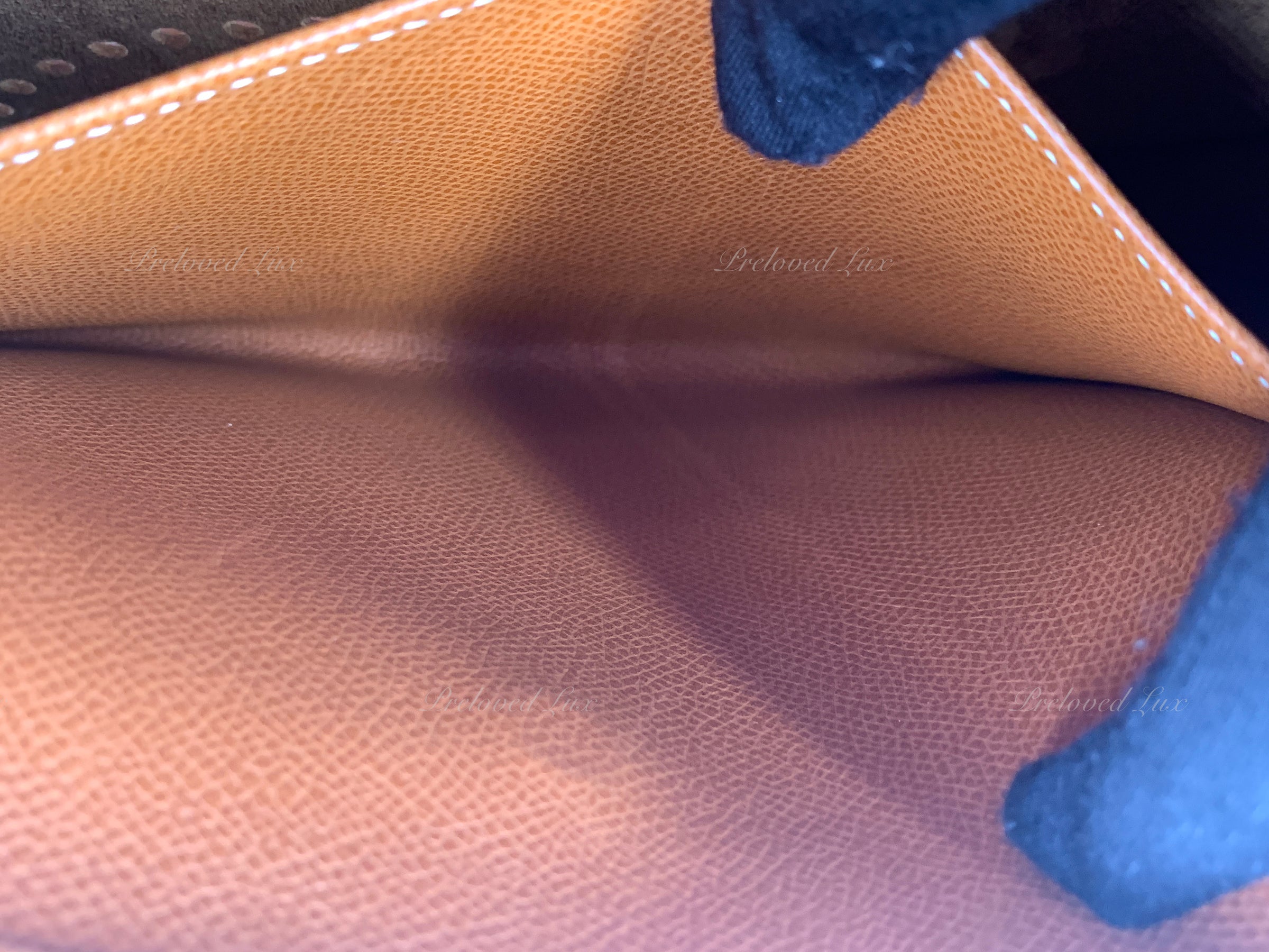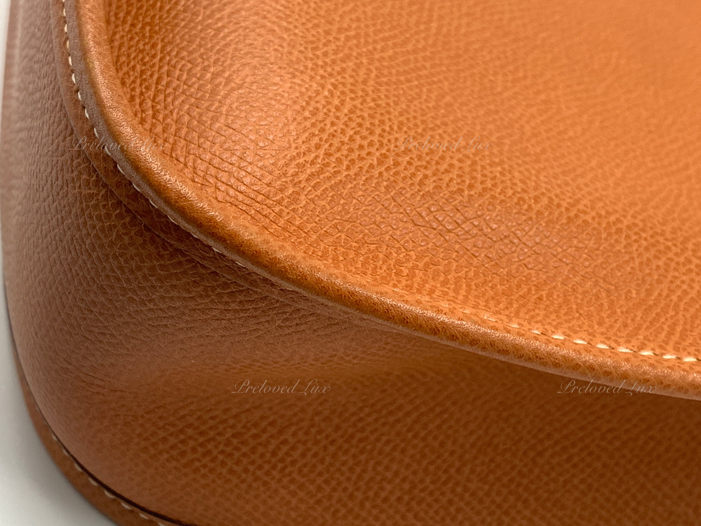 Outside: Pre-owned, in great condition. Exterior leather minor softening of the structure.. Minor fine, hardly noticeable scratches - only can see under studio light and with certain angle (see photos). Corners and piping show mild rubbing and light scuffing. Hardware has fine scratches and some tarnishing. Inside: Overall very clean interior. Strap: Fabric strap with very minor, barely noticeable stains. Hardware shows scratches and areas of tarnish. Button: Functions normally. with minor dark stain on the button. Odor: None |