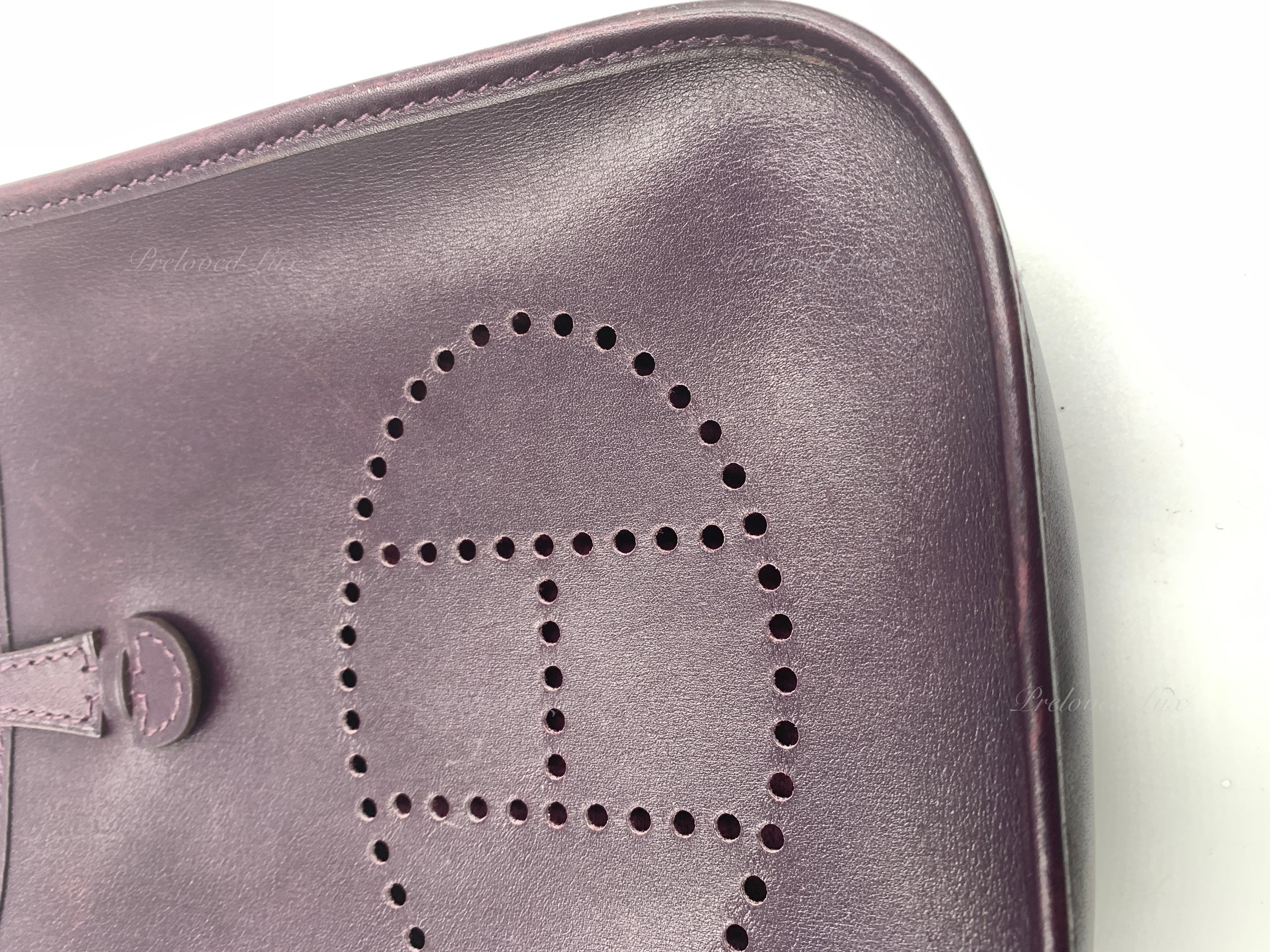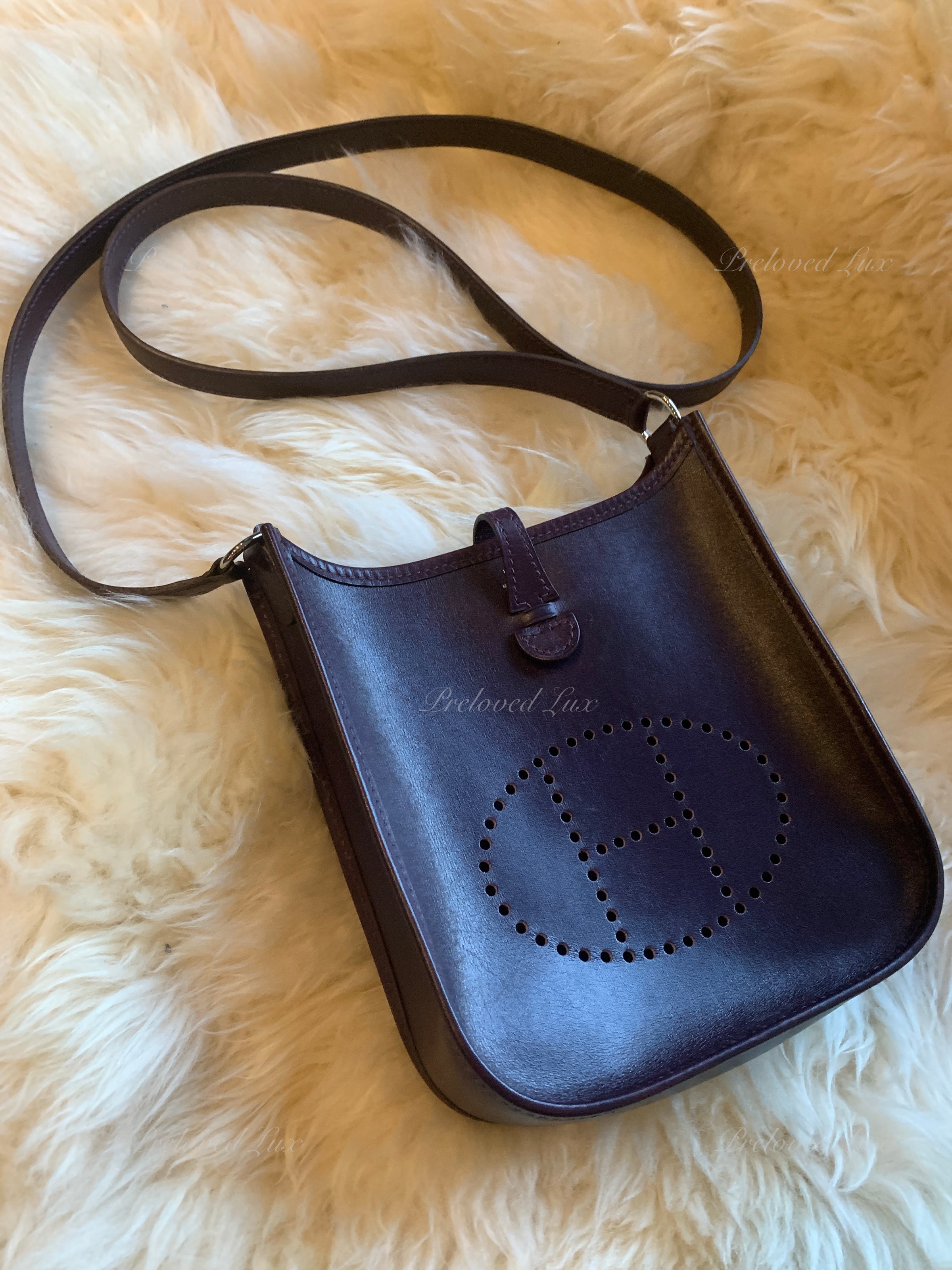 We guarantee this is an authentic Hermes Evelyne I TPM (mini) Handbag or 100% of your money Back. This Hermes Evelyne Crossbody has perforated H design at the front, non-removable shoulder strap, silver hardware. It opens to a raw leather interior. This TPM Mini size is a hard to get item. Good vintage condition.
